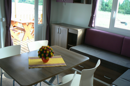 Každý mobilný domček má spálňu s manželským dvoj lôžkom, izbu s dvomi oddelenými lôžkami a kúpeľňu so sprchovacím kútom a toaletou. Súčasťou obytného priestoru je aj jedáleň s rohovou pohovkou, so stolom a stoličkami a TV. V kuchyni spojenej s jedálňou je plne vybavená kuchynská linka so zabudovaným plynovým sporákom, chladničkou, mrazničkou, mikrovlnnou rúrou a kanvicou.